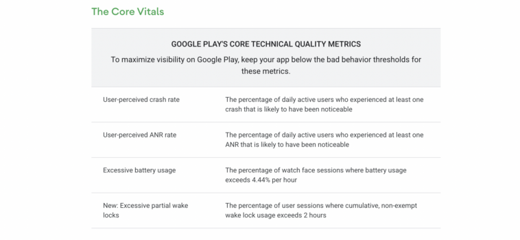 Core metrics include user-perceived crash rate, user-perceived ANR rate, excessive battery usage for Wear OS, and a newly added metric tracking excessive partial wake locks. Google notes that apps exceeding defined thresholds may face visibility impacts on Google Play, and stricter wake-lock enforcement begins March 1, 2026.