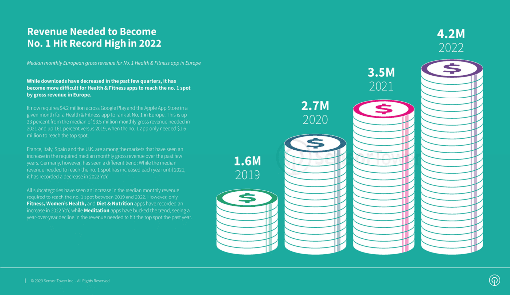 According to Sensor Tower, it now takes $4.2 million in gross revenue per month across the App Store and Google Play to become the top-ranking Health and Fitness app in Europe, up 23% from the $3.5 million required per month in 2021.