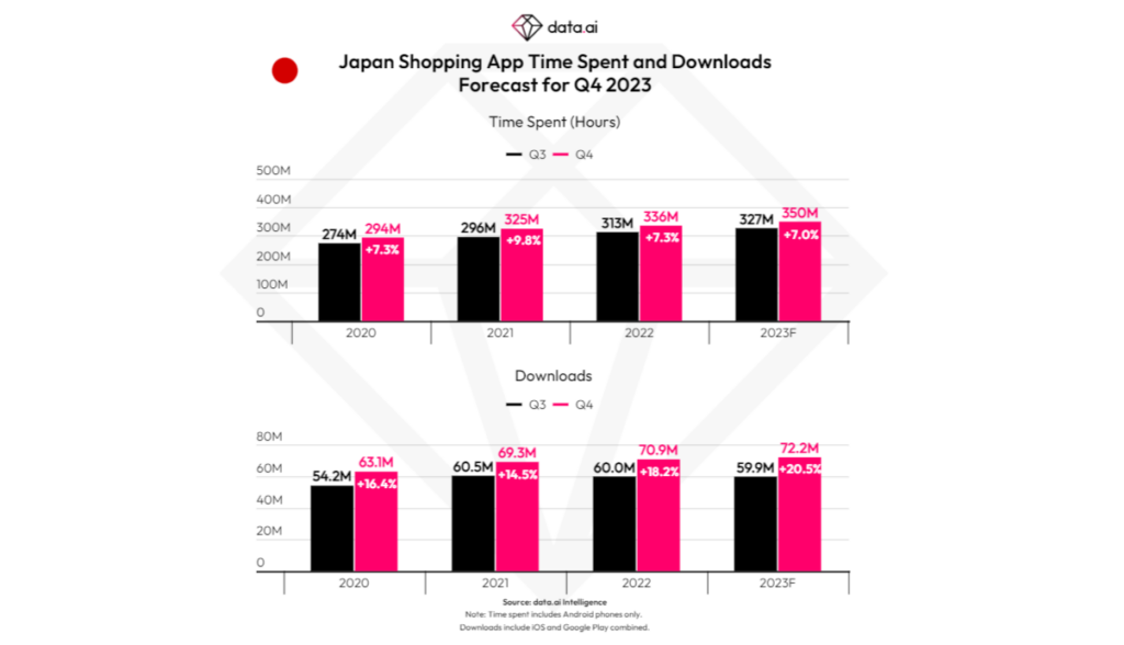 Japan has also shown consistent growth in shopping apps, both in terms of time spent and downloads. Time spent on Android devices for shopping apps is projected to reach 350 million hours in Q4 2023, reflecting a 4.2% year-over-year increase and nearly 20% growth compared to the 2020 holiday season.