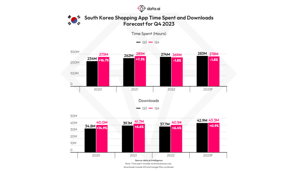 In South Korea, record downloads are expected in Q4, with an estimated 43.3 million downloads. While there may be a slight quarter-over-quarter decline in time spent, the 3.3% year-over-year growth suggests that mobile shopping is still on an upward trajectory in the country.