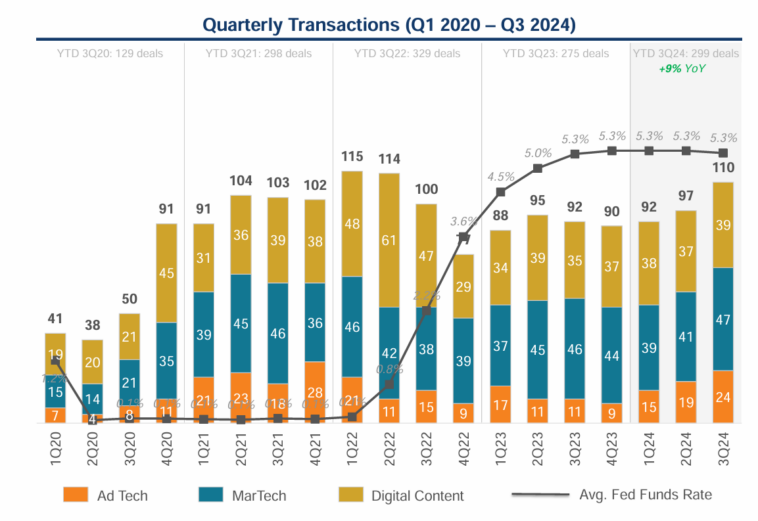 The digital media and advertising technology sectors have seen a significant resurgence in mergers and acquisitions (M&A) activity during Q3 2024, signaling a shift from the sluggish dealmaking landscape of 2023. This year, the macroeconomic environment—highlighted by the Federal Reserve’s first rate cut since the pandemic and the easing of inflationary pressures—has fostered a more favorable climate for strategic investments. The uptick in M&A activity is particularly noticeable in areas like Data/Identity, Connected TV (CTV), Commerce Media, and Mobile, as companies focus on scaling their capabilities to remain competitive and durable in an evolving market. According to LUMA Partners, deal volume in the ad tech space saw a 13% increase from Q2 2024, with significant growth in scaled deals (those valued over $100 million), especially in Ad Tech and MarTech.