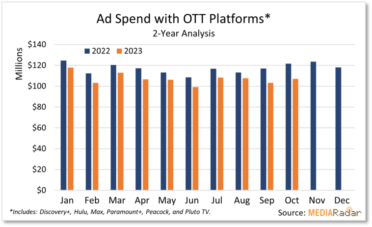 Despite optimistic growth projections for ad-supported streaming, an analysis of six leading platforms—Discovery+, Hulu, Max, Paramount+, Peacock, and Pluto TV—reveals a collective ad revenue dip. According to data from MediaRadar, these platforms generated $1.07 billion in ad revenue from January to October 2023, marking an 8% YoY decline compared to the $1.2 billion generated during the same period in 2022.