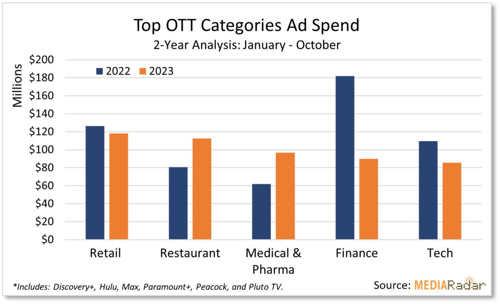 The analysis highlights that five categories—restaurant, medical/pharma, finance, retail, and technology—contributed nearly $503 million, constituting 47% of the total ad spend for these platforms through October. However, this reflects a collective 10% YoY decline.