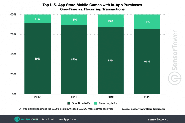 Of games with IAP, 11% offered subscriptions in 2017. As of 2020, that share had increased to around 18% as titles such as My Talking Tom 2 and Yahtzee with Buddies Dice adopted the model.