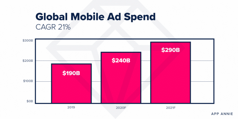 We see that this increasing trend in both game and non-game apps has been reflected in the mobile advertising side. According to App Annie’s latest report, mobile ad spend will reach 290 billion worldwide in 2021, with a 2-year CAGR of 21%.