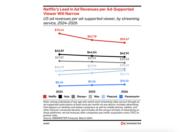 Despite remaining the leader in ad revenue per viewer, Netflix is set to experience a narrowing gap as competitors catch up. According to recent forecasts from eMarketer, Netflix’s ad revenues per ad-supported viewer in the US are projected to decline from $70.44 this year to $59.67 by 2026. Nevertheless, Netflix will continue to generate more ad revenue per viewer than any other streaming service through the end of this forecast period.