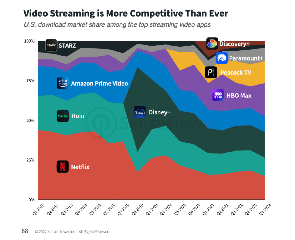 Netflix continues to have the most monthly active users (MAUs), with 39% market share in the US in the first quarter of 2022, according to a new study by Sensor Tower.