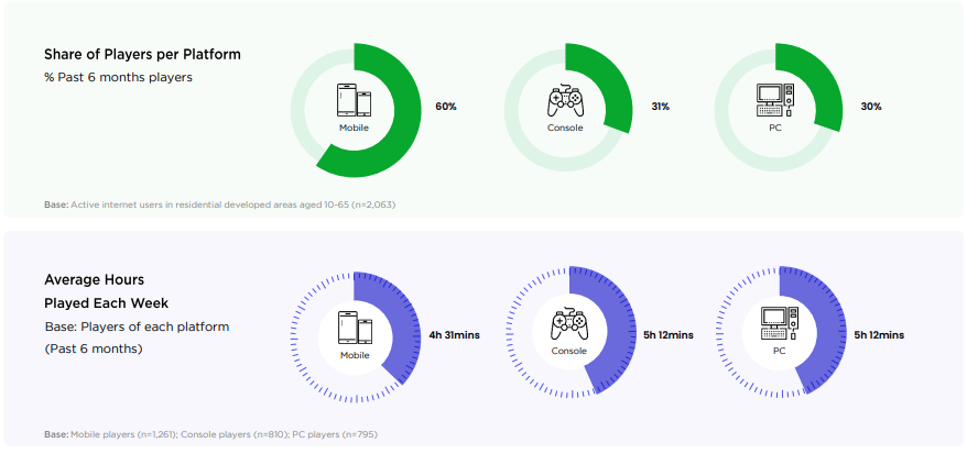 When it comes to device preferences, 60% of players said that they used their mobile devices to play games in the last six months. Meanwhile, 31% used game consoles and 30% used personal computers.