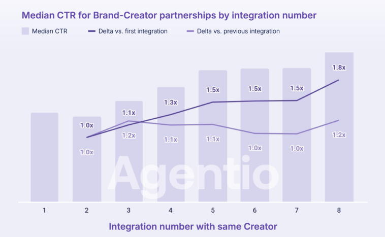 According to the analysis, CTRs increase by roughly 10% with each additional integration involving the same creator. Median CTR performance rises 1.1x by the third collaboration compared with the first, and reaches 1.8x by the eighth integration. Conversion performance follows a similar trajectory: the sixth integration with a creator generates CVRs that are nearly 1.9x higher than those recorded during the initial placement.