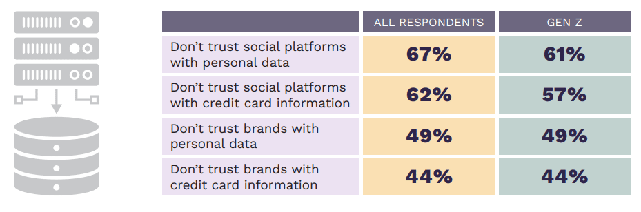 Among all the respondents participated in the survey, 67% said they don’t trust social platforms with personal data, and 62% said they don’t trust how they handle credit card information. Gen Z respondents, on the other hand, seem to trust social platforms more.