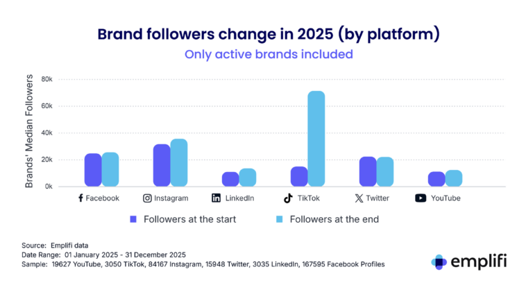 TikTok continues to outpace competitors by a substantial margin. Median brand follower growth surpassed 200% year over year, while engagement rates peaked near 35.9% before closing 2025 at 27.6%—still significantly higher than rival platforms .