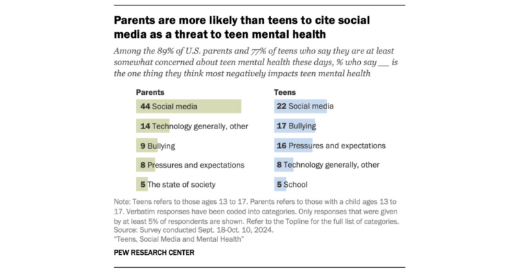 Parents are more likely than teens to blame social media for worsening youth mental health. About 44% of concerned parents cite it as the top negative influence, whereas teens point to a broader mix of factors including bullying, academic pressure, and societal expectations.