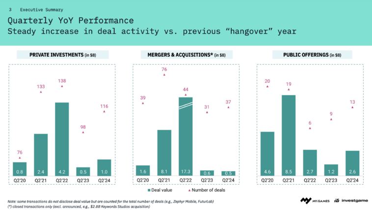 Despite facing ongoing layoffs, studio closures, volatile stock prices, and project cancellations, the games industry continues to demonstrate remarkable resilience. According to InvestGame’s Global Gaming Deals Report Q2’24, in the second quarter of 2024, the gaming industry witnessed 166 closed deals, amassing a total of $4.1 billion. This marks an increase in both deal value and volume, suggesting a gradual recovery from recent downturns and reflecting renewed investor confidence and market stability. The resurgence in deal activity indicates that stakeholders are regaining trust in the industry’s long-term prospects.