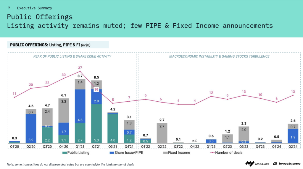 Public offerings, however, remained subdued compared to the boom seen during the COVID-19 pandemic. Few initial public offerings (IPOs), private investment in public equity (PIPE) deals, and fixed-income announcements occurred, primarily due to macroeconomic instability and fluctuating gaming stock prices. These conditions have limited exit opportunities for late-stage investments, prompting a more measured approach from investors.