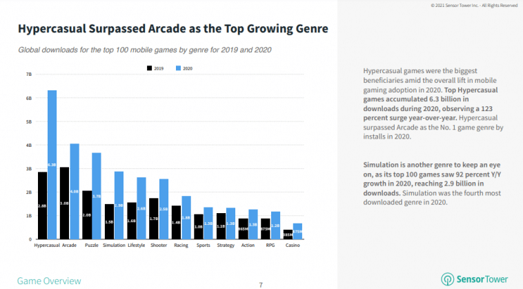 In 2020 when the pandemic and lockdowns skyrocketed mobile game usage and revenue, the Hypercasual market accounted for 31% of global downloads with top titles in the genre accumulated over 6.3 billion downloads across both App Store and Play Store, according to Sensor Tower’s Mobile Game Taxonomy Report.