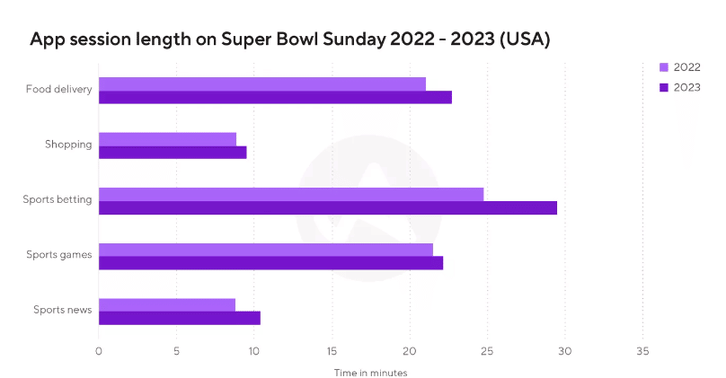 On average, they spent 22.7 minutes on food delivery apps, 9.49 minutes on shopping apps, 29.48 minutes on sports betting apps, 21.47 minutes on sports games, and 10.4 minutes on sports news apps.
